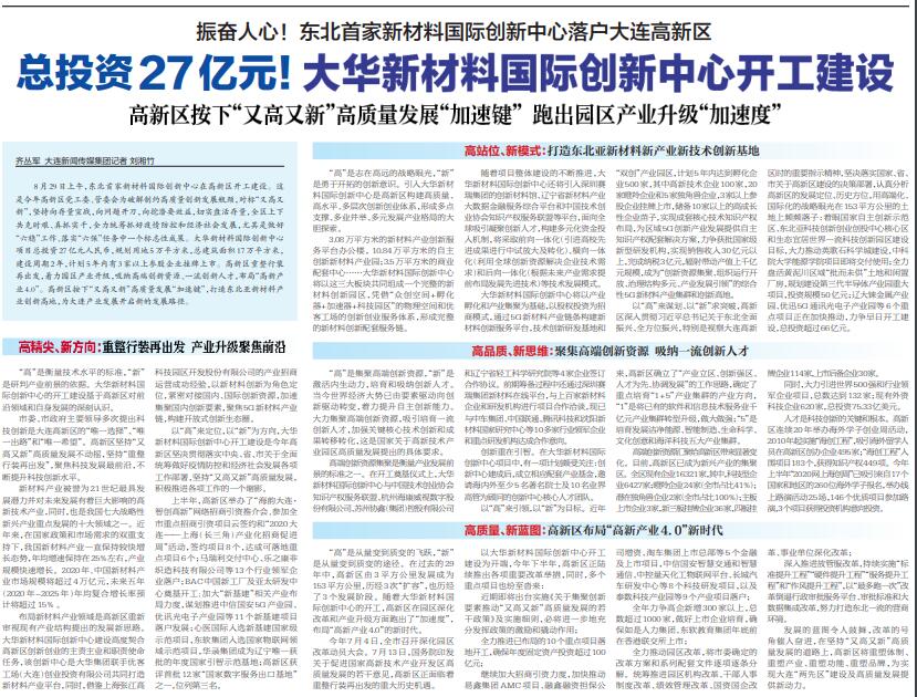 8月29日上午,东北首家新材料国际创新中心在高新区开工建设。这是今年高新区党工委、管委会为破解制约高质量创新发展瓶颈,对标“又高又新”,坚持向存量宣战,向问题开刀,向挖潜要效益,切实盘活存量,全区上下共克时艰、真抓实干,全力统筹抓好疫情防控和经济社会发展,尤其是做好“六稳”工作、落实“六保”任务中一个标志性成果。大华新材料国际创新中心项目总投资27亿元人民币,规划用地5万平方米,总建筑面积17万平方米,建设周期2年,计划5年内有3家以上参股企业挂牌上市。高新区重整行装再出发,着力园区产业升级,吸纳高端创新资源、一流创新人才,布局“高新产业4.0”。高新区按下“又高又新”高质量发展“加速键”,打造东北亚新材料产业创新高地,为大连产业发展开启新的发展路径。